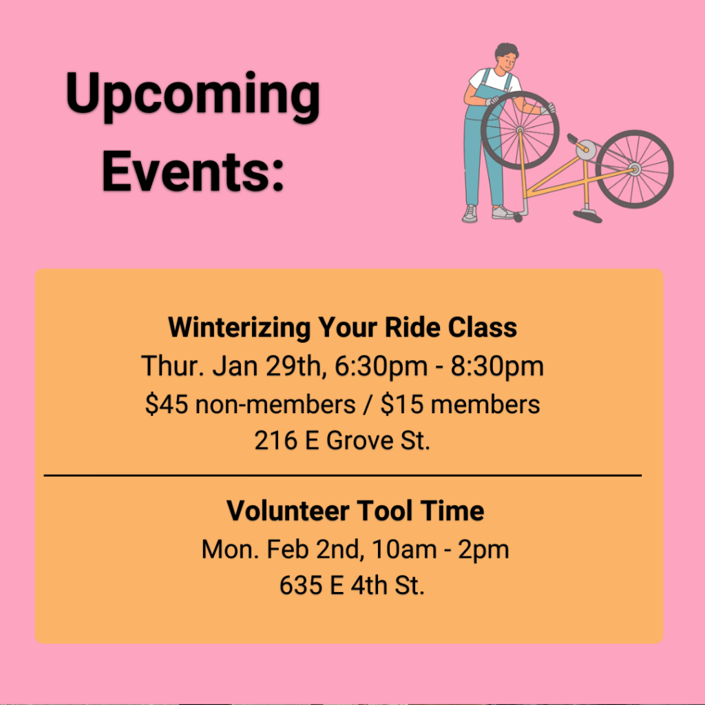 These workshops include our Bicycle Repair Class on scheduled Wednesdays and Thursdays, the Femme, Trans, Women, & Non-Binary bike education workshop on the first Tuesday of each month, and our Tune-Up Tuesdays on every other Tuesday. See our After Hours Workshops page for more specific dates and information!