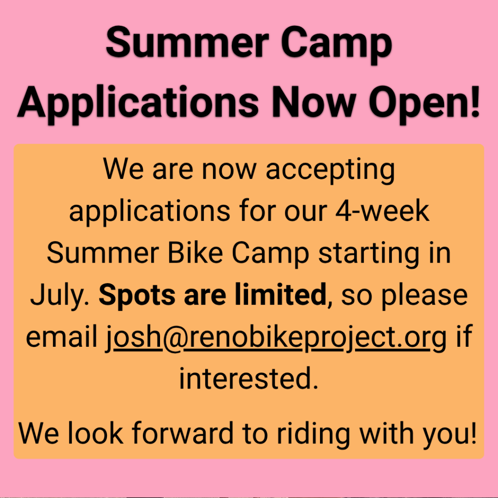We need your support to continue providing subsidized bikes, cycling education, bike repair internships, and other classes and programming to low-income commuters and bicycle enthusiasts in the Reno area.